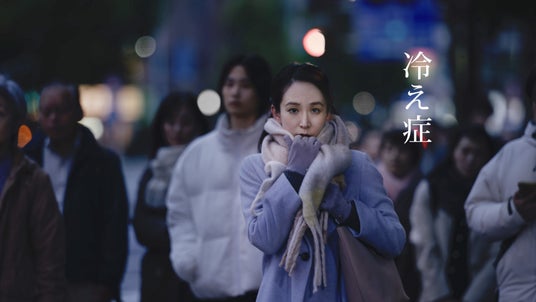 「冷え症、つらくありませんか?」と問いかけられる女性。冬の寒さに震えるシーンは、都内某所で撮影しました。まだ暖かさが残る東京で寒さを演出するために、エキストラの方々にも冬の装いをしてもらいました。その一角だけが冬の様相となる中、出演の皆さんに絶妙な演技で寒さを表現していただきました。