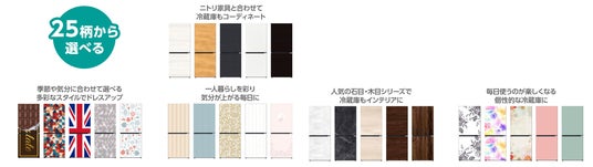対応する冷蔵庫にピッタリ合うサイズのマグネットシートなので貼り直しがしやすく、工具や難しい作業は不要。ニトリの家具と合わせた柄もラインナップしており、冷蔵庫を買い替えなくても、インテリアに合わせた“自分らしいキッチン”づくりをサポートします。