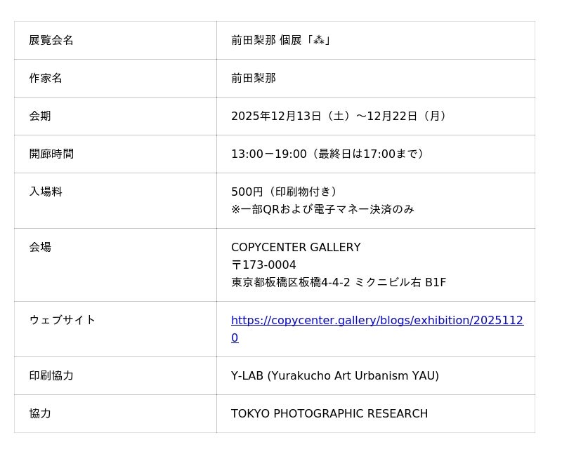 アートギャラリー「COPYCENTER GALLERY」(東京・板橋)は、2025年12月13日(土)から12月22日(月)まで、前田梨那による個展「⁂」を開催します。本展では、写真が持つ「痕跡」としての側面に焦点を当て、記憶の不確かさや個人の輪郭といったテーマを探求する作品群を、名前のない星群(アステリズム)として展示します。