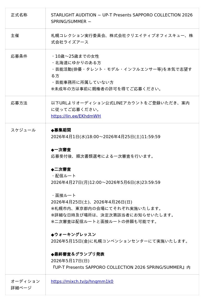 ■「STARLIGHT AUDITION ~ UP-T Presents SAPPORO COLLECTION 2026 SPRING/SUMMER ~」について