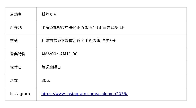 北海道を中心に、飲食店や宿泊・温浴施設、各種アミューズメント施設などを展開しているセイザングループの株式会社セイザンフーズ(本社:北海道札幌市中央区南3条西2丁目14ニコービル8階 代表取締役社長:晴山 徳貴)は、北海道ではまだ珍しい朝食に特化した新店舗「朝れもん」を、札幌すすきのエリアで、2026年4月6日(月)にオープンいたします。北海道の豊かな食材を贅沢に使用し、一日の始まりを最高の形で迎えられる、これまでにない朝食体験を提供いたします。