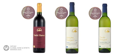 左から、余市ハーベスト ツヴァイゲルト スペシャル キュヴェ 2021、北島ヴィンヤード ~No.4~ケルナー 2024、田崎ヴィンヤード ソーヴィニヨン・ブラン 2024