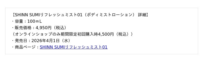 株式会社ヒューレー(本社:北海道札幌市)日常の生活に寄り添い、揺らがない肌の基礎「‐芯‐」をつくるというコンセプトのもと、スキンケア商品を展開する北海道生まれのスキンケアブランド「SHINN(シン)」からボディミストローションが2026年4月1日(水)よりオンラインストアにて発売。