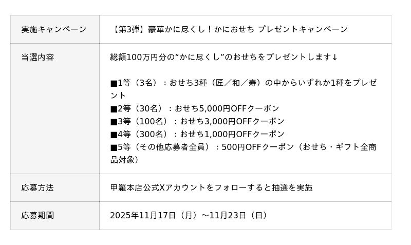 さらに、抽選で総額100万円分(割引を含む)の「特選かにおせち」をプレゼントするキャンペーンも同時開催します。甲羅本店の公式X(旧Twitter)でのフォロー&リポストでどなたでも気軽にご応募いただけます。