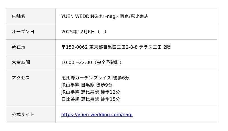 セルフフォトウェディングスタジオ「YUEN WEDDING(ユエン・ウェディング)」を運営する合同会社yuen(本社:東京都/代表:福田拓実)は、2025年12月6日、東京都目黒区三田に和装専門セルフフォトウェディングスタジオ「YUEN WEDDING 和 -nagi- 東京/恵比寿店」をオープンいたします。