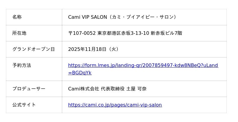 Cami株式会社(本社:東京都港区、代表取締役:土屋可奈)は、代表・土屋可奈のプロデュースプロジェクト第二弾として、エステサロン「Cami VIP SALON」を、2025年11月18日(火)にグランドオープンすることをお知らせいたします。