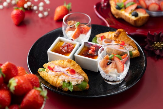 セイボリーには、フォワグラの濃厚さに相性の良い苺の甘酸っぱさをプラスした「フォワグラのブリュレ 苺のアクセント」や、彩り豊かで食べ応えのある「サーモンと海老のクロワッサンサンド」、ミルキーでコクのあるモッツァレラチーズに苺を組み合わせた「苺とモッツァレラチーズのムース」をご用意。