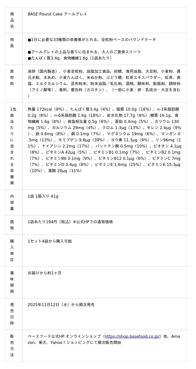 ベースフード株式会社(本社:東京都目黒区、代表取締役:橋本舜、https://basefood.co.jp)は、本格スイーツ「BASE Pound Cake」シリーズを新展開し、その第一弾として「BASE Pound Cake アールグレイ」を2025年11月12日(水)よりベースフード公式HPオンラインショップ(https://shop.basefood.co.jp/)、他ECサイトにて順次販売開始します。