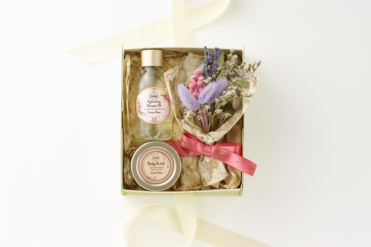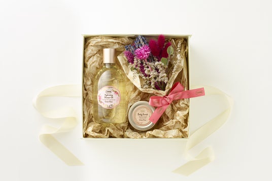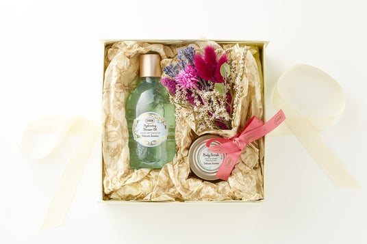 内容 ハイドレイティングシャワーオイル 300mL、ボディスクラブ 60g、フラワーブーケ、ギフトボックス