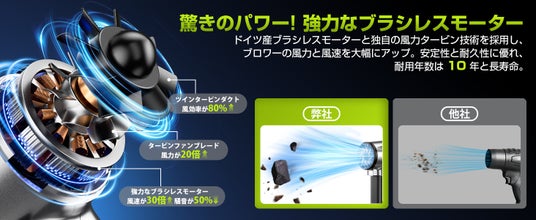 300,000回転/分のモーターを搭載。10cmの距離から1.8kgまでの物体を吹き飛ばせる力を持ち、台風級の風力で洗車や除雪を瞬時に完了。時間を大幅に短縮し、手間のかかる拭き上げ作業も不要です。