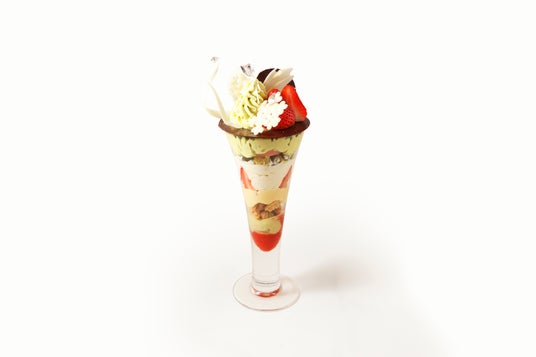 クリスマスカラーをいちごとピスタチオで表現したパフェ。