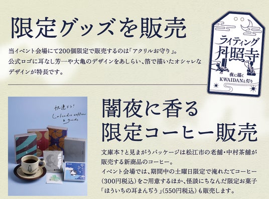 ■オリジナル怪談グッズ販売!オリジナルグッズとしてアクリルお守り(800円・200個限定)を販売。期間中の土曜日には小泉八雲に着想を得た松江市の老舗・中村茶舗の特性コーヒー(ドリップ300円、テイクアウト用パッケージ商品は1000円)のほか、怪談関連の商品として中浦食品からは「ほういちの耳まんじう」も販売します。