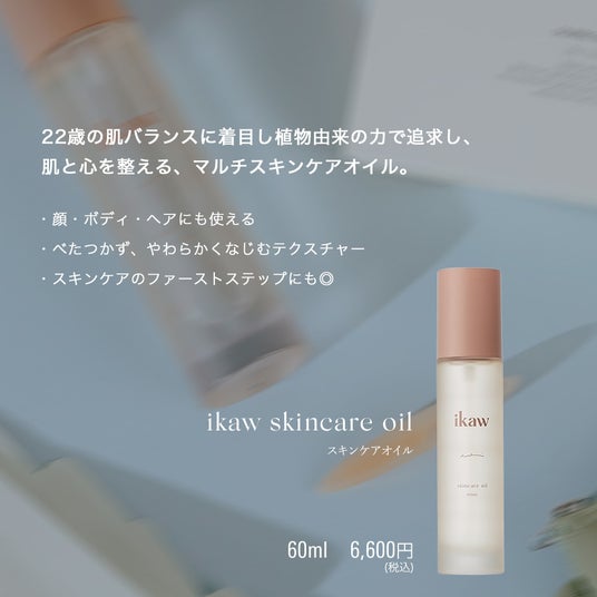 「あなた」という意味を持つスキンケアブランド「ikaw」(イカウ) は、あなたの想いのために生まれました。何度も触れたくなるような、とろみのある質感が印象的なオイルは、まさに “新たなあなたとの出会いであり肌への喜び。” 肌そのものであったような心地のよい一体感を味わえます。