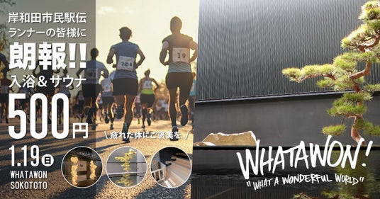 株式会社antiqua(本社:大阪府和泉市)が手がける南大阪のエンターテインメントモール「WHATAWON(ワタワン)」内の温浴施設『京町湯屋SOKOTOTO(ソコトト)』にて、2025年1月19日(日)、岸和田市民駅伝に参加するランナーを対象に特別価格500円で入浴・サウナの利用を提供するキャンペーンを実施します。