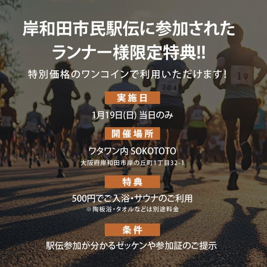 岸和田市で開催される市民駅伝を楽しむ全てのランナーに嬉しいお知らせです!スポーツ後のリフレッシュや疲労回復に最適な「京町湯屋SOKOTOTO」が、特別価格500円でご利用いただけるキャンペーンを実施!