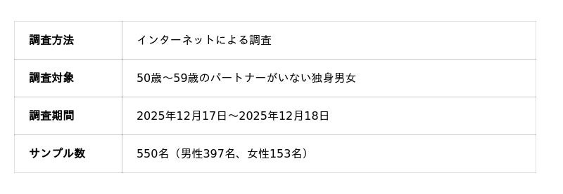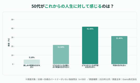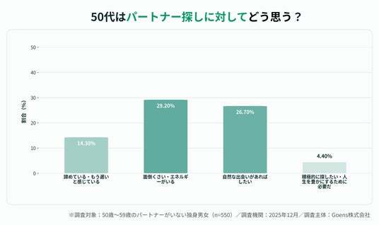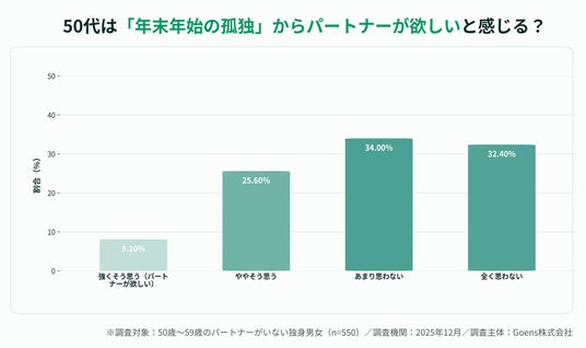 50歳以上限定のマッチングアプリ「Goens(ゴエンズ)」(運営:Goens株式会社/本社:愛知県名古屋市/CEO : 廣澤 和也)は、50代特有の孤独や恋愛観の実態を明らかにするため、パートナーがいない全国の50代独身男女を対象に意識調査を実施しました。