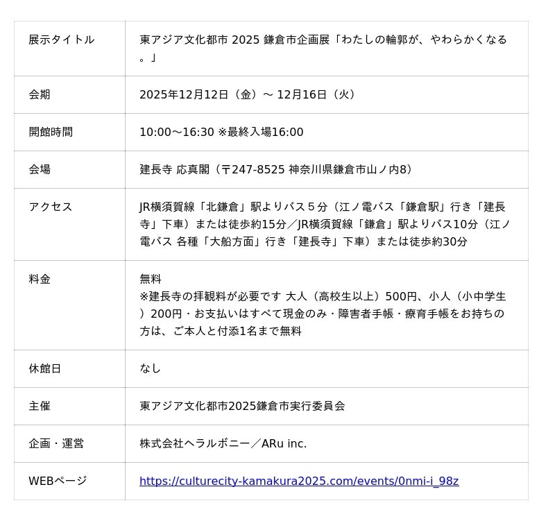 株式会社ヘラルボニー(以下、ヘラルボニー)は、ARu inc.(アル、以下ARu)と協働し、東アジア文化都市2025鎌倉市実行委員会が主催する企画展「わたしの輪郭が、やわらかくなる。」の企画・運営を担当いたします。本企画展は、12月12日(金)から12月16日(火)までの5日間催され、歴史的建造物である建長寺 応真閣を舞台に、作家たちの作品と光のインスタレーションが静かに交わり、来場者の感覚に寄り添う体験を創出します。