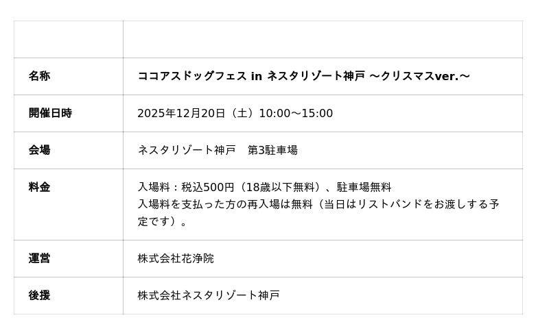 株式会社ネスタリゾート神戸(本社:兵庫県三木市、代表取締役社長:田中淳)は、2025年12月20日(土)、大自然の冒険テーマパーク「ネスタリゾート神戸」で開催される『ココアスドッグフェス ~クリスマスver.~』に後援し、愛犬と過ごす特別な時間を応援いたします。