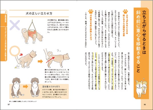 介護はなにより飼い主が体力的にも、精神的にも負担になりすぎないことが大切です。そのため、早い段階から介護をラクにする心構えといった内容、そして立ち上がり補助や寝返り補助まで、実践的なノウハウまで幅広く紹介しております。