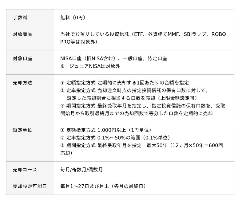 株式会社SBI証券(本社:東京都港区、代表取締役社長:高村正人、以下「当社」)は、2025年12月6日(土)より、投資信託「定期売却サービス」の売却額の指定方法に「定率指定方式」及び「期間指定方式」を追加し、合わせて、「NISA口座での定期売却設定」を可能にする機能拡充を実施することをお知らせします。
