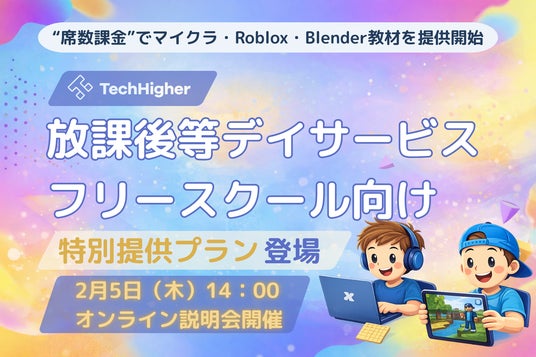 10代向けデジタル人材育成サービス TechHigher を運営する株式会社エクシード(本社:東京都渋谷区、代表取締役:澤部愛子)は、、放課後等デイサービスおよびフリースクール向けに、運営実態に合わせて設計した「マイクラ・Roblox・Blender教材 特別提供プラン」を2026年2月より提供開始します。
