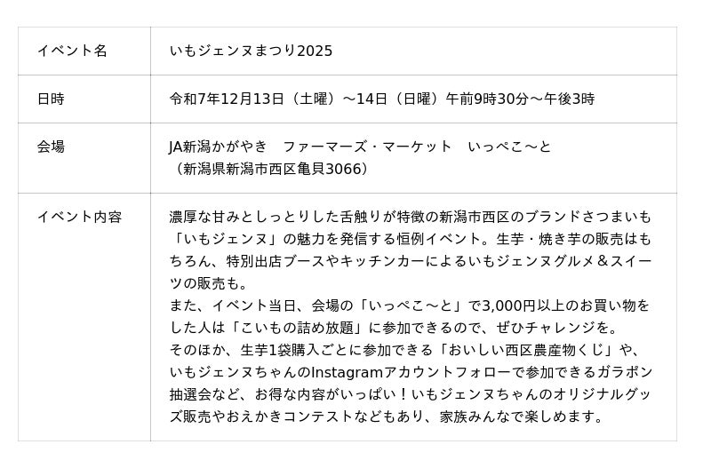 本製品は、以下のイベント会場の高野酒造×新潟大学いもジェンヌプロジェクトブースにて数量限定で販売いたします。