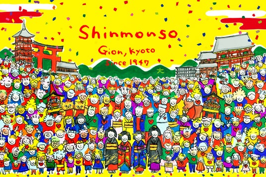 「祇園という伝統と格式のある場所に携われることを光栄に思います。新門荘さんのおもてなしの精神には、私の“MINNA AWESOME”というテーマと共通する優しさと包容力を感じました。私の絵が少しでも多くの方に祇園という街の魅力を伝えるきっかけになれば幸いです。」