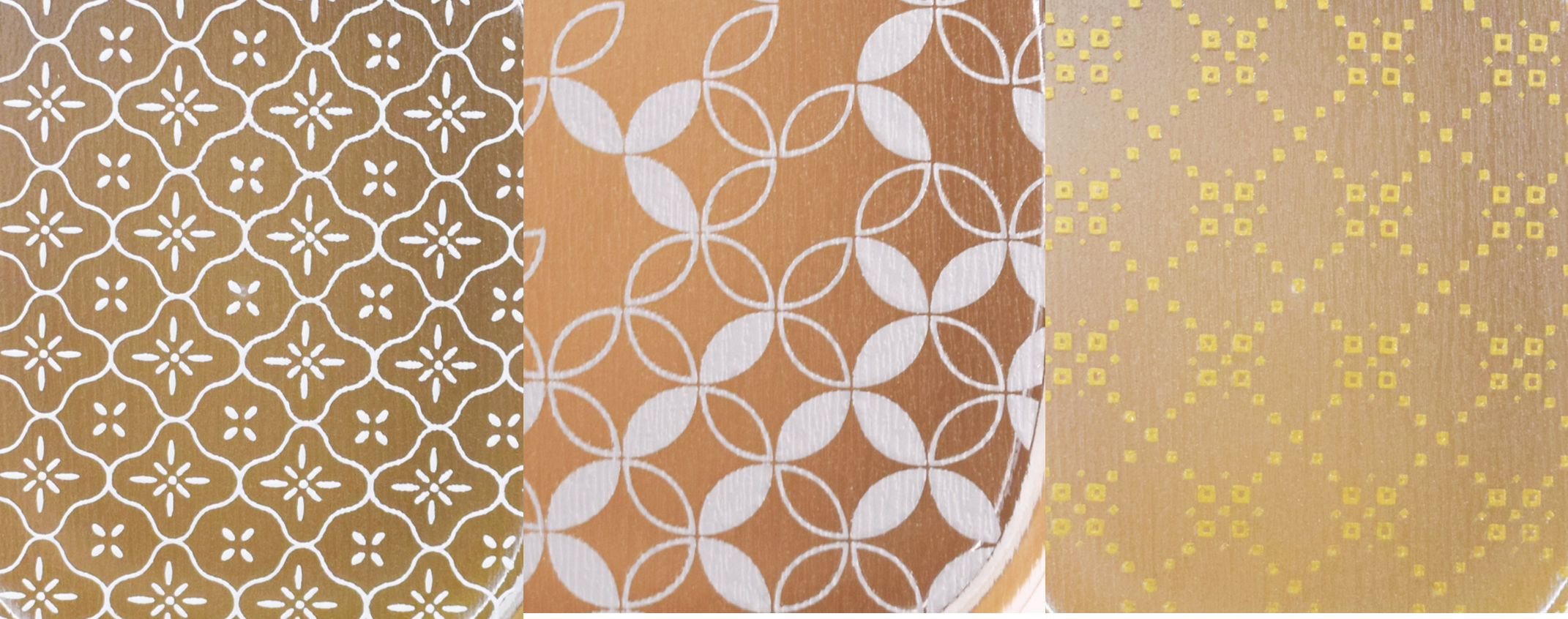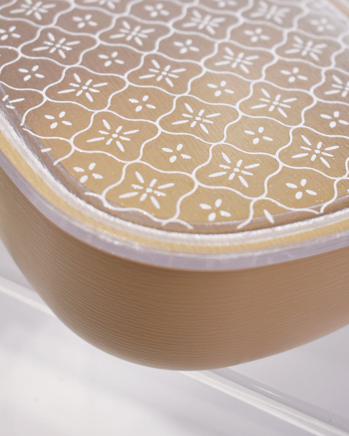 - フタにすりガラスのような印象。透明なフタに凹凸の加工がされていて、モダンな柄がプリントされています。白木風の容器との組み合わせはみずみずしく新鮮な印象。フタには柄がプリントされています。古い窓ガラスや切子ガラス模様から着想を得た模様です。