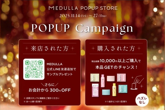 ライズヘアケアブランド「MEDULLA(メデュラ)」は、11/14(金)~11/27(木) の期間で有楽町マルイ1FにてPOP UP STOREを出店します。本出店は2024/3/17に閉店した以来、約1年8ヶ月ぶりの有楽町マルイへの再出店となります。新作のクリスマスコフレセットやプレゼントにも適した単品商品が煌びやかに彩るポップアップの世界はこれまでMEDULLAにお越しいただいたことがあるお客様にも、まだMEDULLAを知らない新しいお客様にも特別感のある空間を提供します。MEDULLAの2025年初となるポップアップにぜひお越しください。