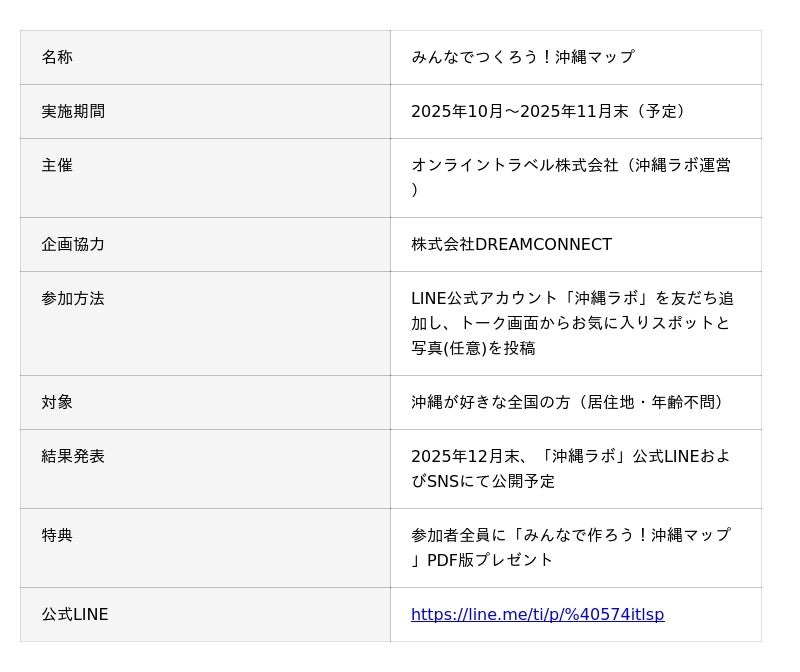オンライントラベル株式会社(本社:大阪府大阪市)が運営する日本最大級の沖縄メディア「沖縄ラボ」は、株式会社DREAMCONNECT(本社:神奈川県横浜市)の企画協力のもと、LINE上でユーザー参加型キャンペーン「みんなでつくろう!沖縄マップ」を実施しています。