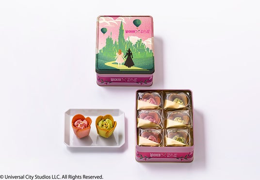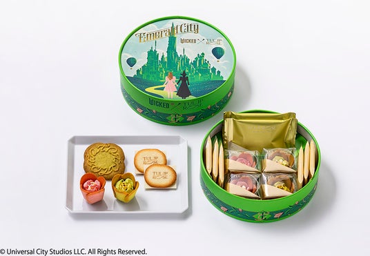 『チューリップローズ <WICKED>』は、グリンダを思わせるピンクが印象的なスペシャル缶。中には、代表作『チューリップローズ』から春限定“ストロベリーバター”と映画『ウィキッド 永遠の約束』とのコラボ限定“ピスタチオバター”の2味を詰合せました。互いを想いあう2人の魔女をイメージした、ピンクとグリーンの2味が仲良く寄り添います。