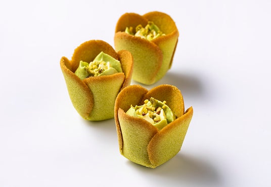 芳醇な香りのピスタチオ&バターの生食感ショコラクリームを、フランス産発酵バター香るグリーンの花びらラングドシャクッキーの中にとろっとしぼりました。