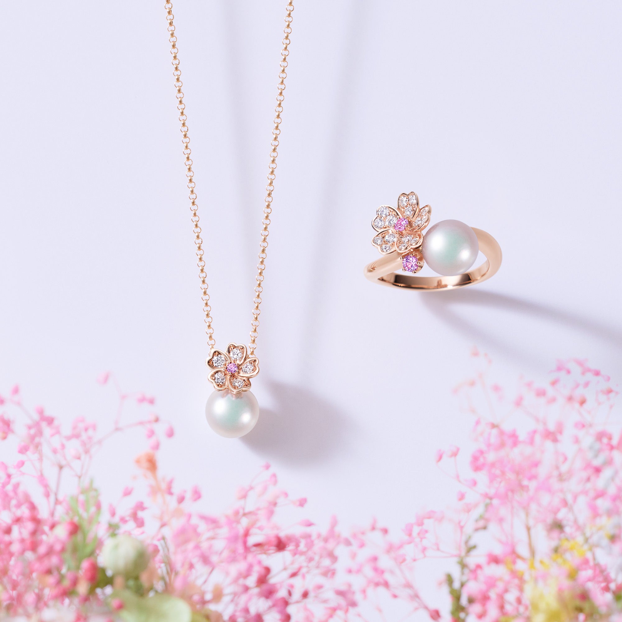 小さな輝きがそっと花開くさくらモチーフの新作や、パールリングがモチーフの「Ring Charm」にイエローゴールドの新作とパールネックレスが登場。