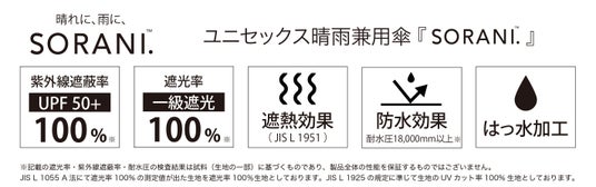 「SORANI.(ソラニ)」シリーズは、全カラー、遮光率100%※、紫外線遮蔽率100%※の一級遮光の機能に加え、耐水圧18,000mm以上※の高い防水性と、シンプルでスタイリッシュなデザインを兼ね備え、性別や年代を問わずあらゆるライフスタイルにマッチします。