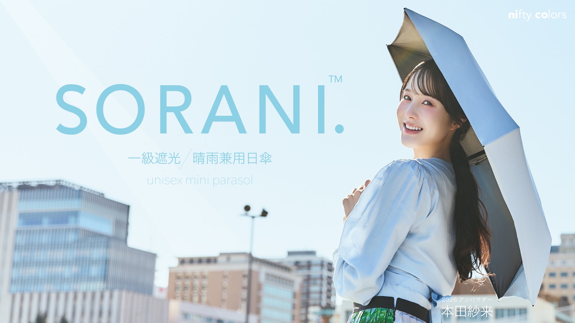レイングッズメーカー株式会社ニフティカラーズ(本社:東京都墨田区)は、ユニセックスで使用できる高機能な晴雨兼用傘「SORANI.(ソラニ)」の新商品を発売開始しました。2026年は、ニフティカラーズブランド(「SORANI.」を含む)のアンバサダーに本田紗来さんを起用いたしました。本田紗来さんビジュアルの中から「SORANI.」の6型をご紹介いたします。