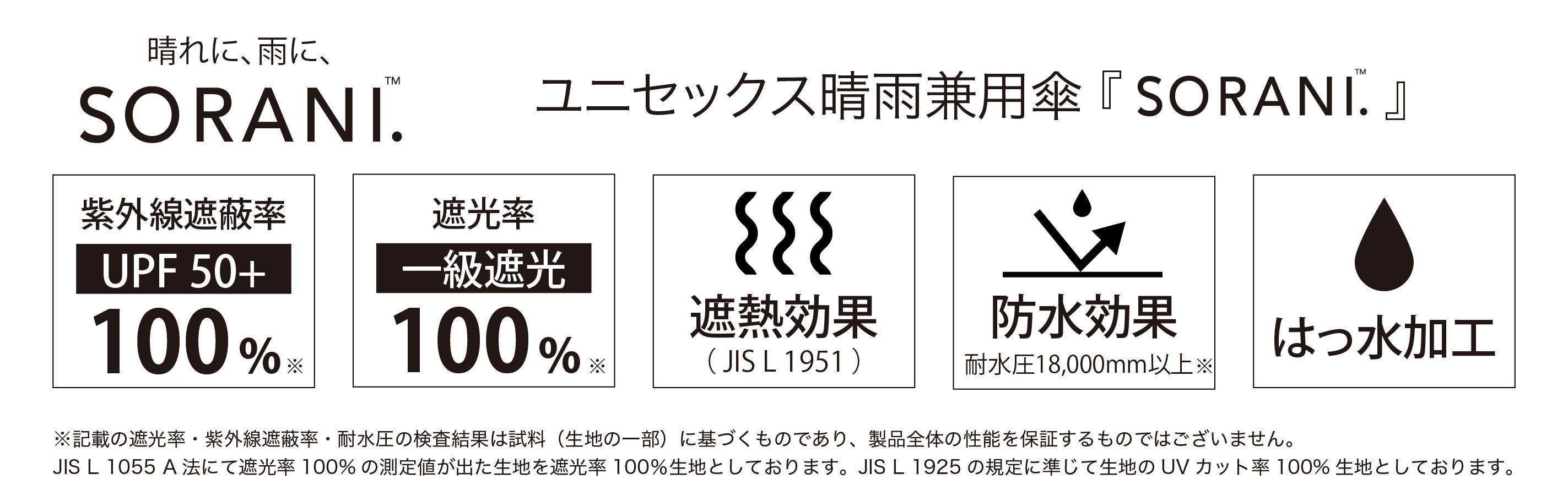 「SORANI.(ソラニ)」シリーズは、全カラー、遮光率100%※、紫外線遮蔽率100%※の一級遮光の機能に加え、耐水圧18,000mm以上※の高い防水性と、シンプルでスタイリッシュなデザインを兼ね備え、性別や年代を問わずあらゆるライフスタイルにマッチします。