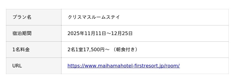 東京ディズニーリゾート(R)・オフィシャルホテルの東京ベイ舞浜ホテル ファーストリゾート(千葉県浦安市舞浜1-6)は、クリスマス気分を盛り上げるデコレーションをした客室を利用する宿泊プランを販売いたします。