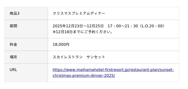 赤・緑・白の鮮やかなクリスマスカラーをベースに天井に舞う雪、夜空に輝く星の美しさに由来するシャンパンゴールドのイルミネーションや、ポインセチアの花言葉である「幸運を祈る」気持ちに寄り添うようなあたたかみのあるキャンドルライトにより華やかなきらめきに包まれます。