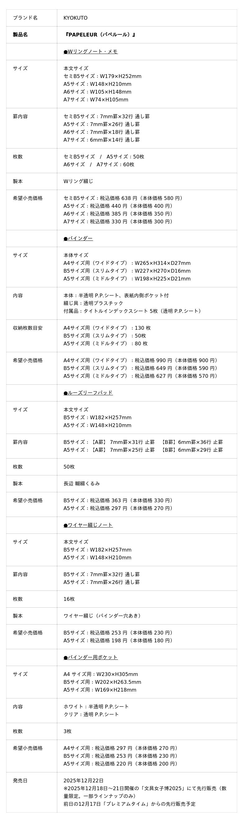 この度KYOKUTOブランド『PAPELEUR(パペルール)』より、Wリングノート・メモ、バインダー、ルーズリーフパッドをはじめとするバインダー関連アイテムの計54アイテムを2025年12月22日より順次発売いたします。