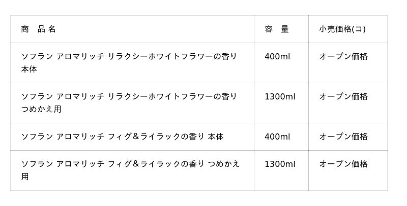 ・“癒し、リラックス”をテーマにした『ソフラン アロマリッチ リラクシーホワイトフラワーの香り』、“みずみずしさ”をテーマにした『ソフラン アロマリッチ フィグ&ライラックの香り』を新発売
