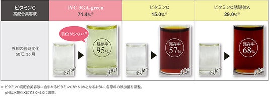 弊社では“ビタミンC高配合”のメリットを最大限に引き出す鍵は“安定性の向上”にあると考え、独自の特許技術により「安定性×美肌効果×持続性」を兼ね備えたビタミンC誘導体*「iVC 3GA-green」を開発しました。iVC 3GA-greenは、優れた安定性を有しており、経時的な着色が少なく、高い残存率を維持します(図1)。そのため、原液タイプの美容液やビタミンC高配合化粧品への配合に最適な成分です。