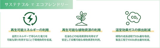 美肌効果としては、抗光老化作用、コラーゲン産生促進、メラニン産生抑制など、複数の作用メカニズムによる多角的なアプローチでエイジングケア効果を発揮します(図2)。さらに、iVC 3GA-greenは100%植物由来の原料であり、製造工程においても環境負荷を最小限に抑えたサステナブルな成分です(図3)。