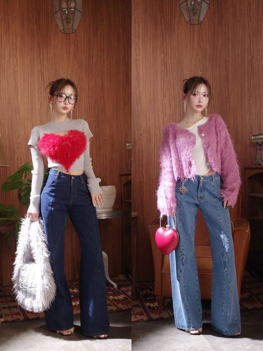 - (左)Heart Shaggy Knit 17,930円 / Stitch Line Denim Pants 22,550円 / Shaggy Shoulder Bag 10,450円