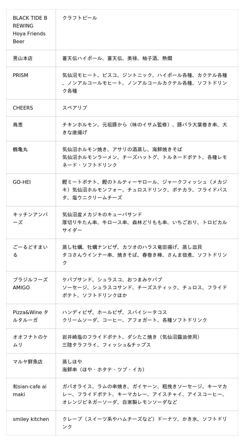 今回の出店店舗は、クラフトビールは「BLACK TIDE BREWING」、日本酒の酒蔵「男山本店」をはじめ、気仙沼の美味しい食事を楽しめるお店が計15店舗出店いたします。