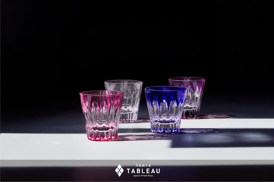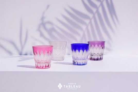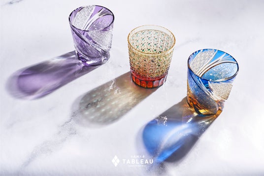 吉祥文様「亀甲紋」を咲き誇る花のようにアレンジし、しなやかさと華やかさをまとった意匠に昇華。透き・金赤・ルリ・紫の4色展開で、特別な節目にふさわしい記念品としても最適です。TABLEAUならではの感性が息づく新しいかたちの江戸切子。公式直販サイトTABLEAUオンラインショップでお求めいただけます。