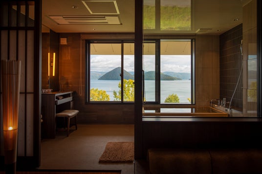 全客室レイクビュー、自家源泉から汲み上げた天然温泉(加温)を、客室内の浴室でかけ流しにてお楽しみいただけます。 洞爺湖を望むプライベートな空間で、心ほどける湯浴みのひとときを。