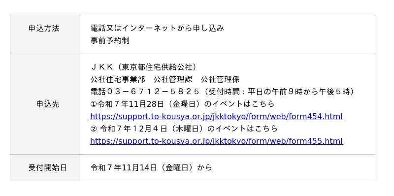 JKK東京(東京都住宅供給公社:東京都渋谷区、理事長:浜 佳葉子、以下「JKK」)は、社会福祉法人恩賜財団済生会支部東京都済生会(支部長:杉村栄一、以下「済生会支部東京都済生会」)、東京都と連携し、11月28日(金曜日)と12月4日(木曜日)に、中央区と墨田区において、高齢者向けのイベントを3者共催で実施します。