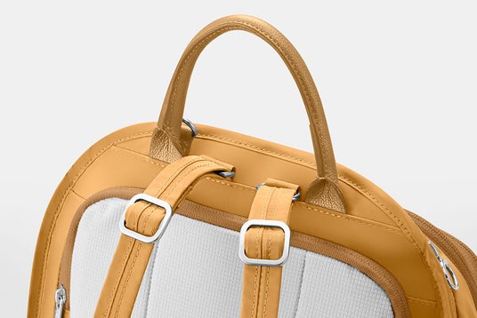 持ち運びに便利な牛革のトップハンドルを備えます。