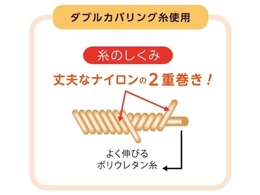 【生地の特徴】よく伸びるポリウレタン糸に丈夫なナイロン糸を2重に巻き付けたダブルカバリング糸を採用しています。ダブルカバリング糸とナイロン糸で交互に編み上げることにより、破れにくく丈夫な生地に仕上げました。ストッキングをはいてアクティブに動き回る方にもオススメです。