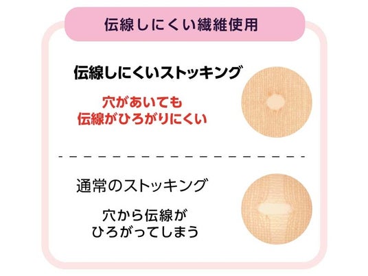 【生地の特徴】よく伸びるサポーティ糸で編み上げているので肌触りがなめらかで、肌なじみもよく適度なフィット感です。通常のストッキングとは異なり、穴があいても伝線がひろがりにくい繊維を使用していることも特長です。